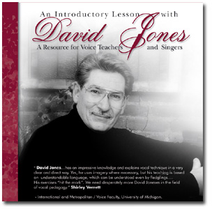 An introductory double CD voice lesson with David Jones uses the training of the Swedish/Italian and Italian Schools for all styles of singing. This CD has helped teachers and singers to develop a vocal protection, in all styles of singing. The first CD is designed to describe vocal concepts that have historically helped structure international careers and has served as the basis for vocal health over decades. The second CD includes a series of exercises specifically designed to help each singer accomplish head voice development, fullness of resonance, registration balance, breath coordination, and more total voice potential.